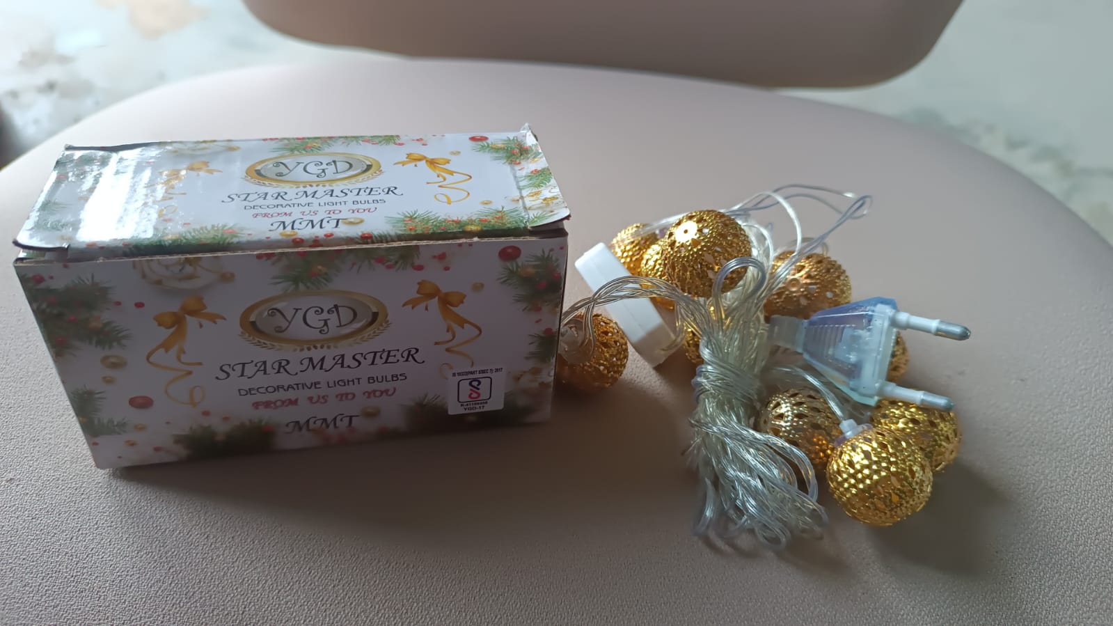 A 3-meter LED string light featuring hollow golden metal balls, creating a warm and festive glow. Ideal for Diwali, Christmas, weddings, parties, and home décor, these plug-in lights provide continuous illumination without batteries. Lightweight, flexible, and energy-efficient, they are perfect for bedrooms, balconies, gardens, or gifting.