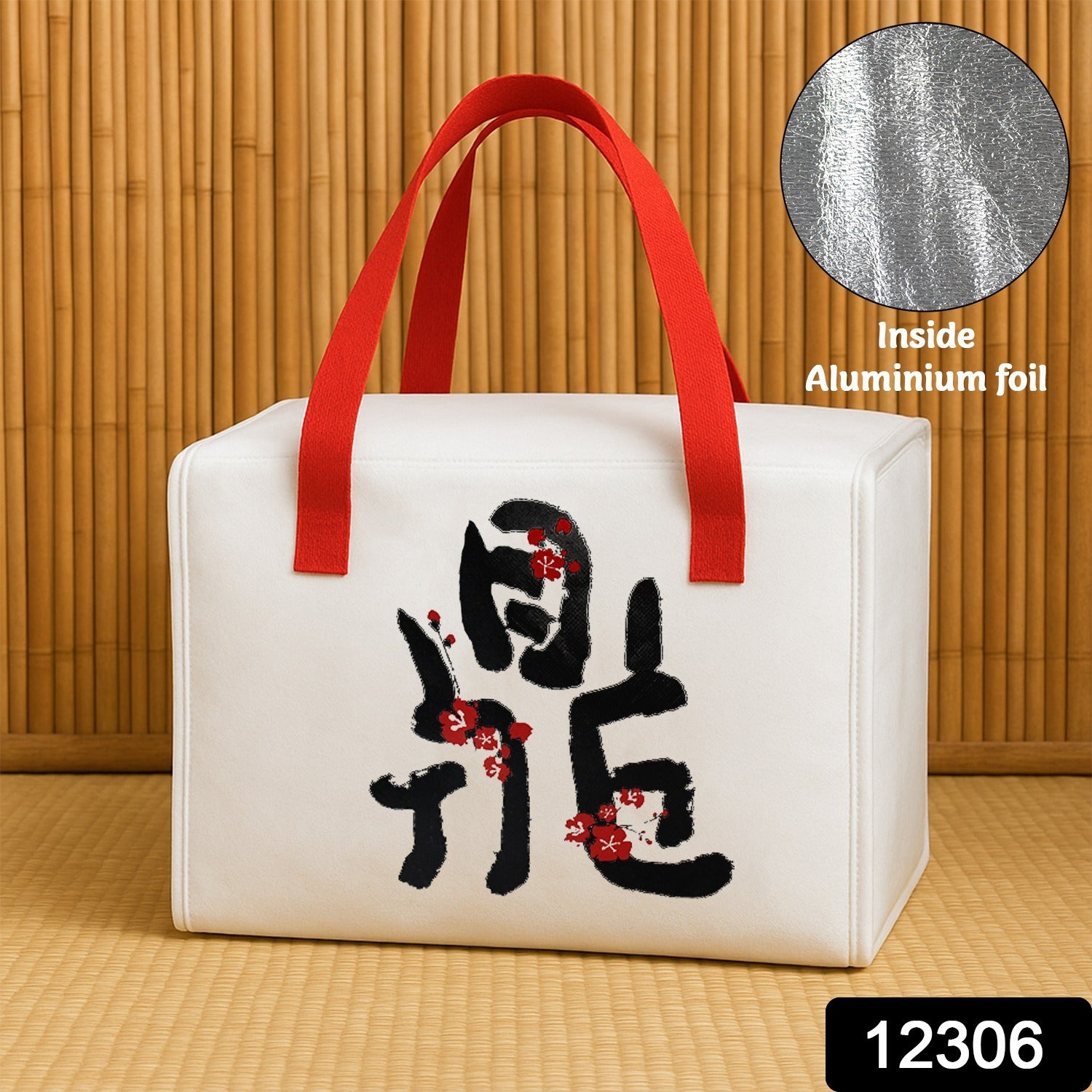 Reusable insulated lunch bag with aluminium foil lining to keep food hot or cold for hours. Lightweight, durable & eco-friendly design with sturdy red handles and zipper closure. Perfect for office, school, travel & picnics.
